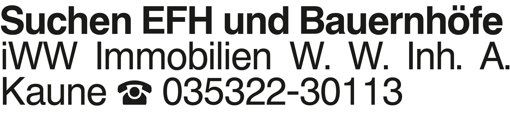 Suchen EFH und Bauernhöfe Suchen EFH und Bauernhöfe iWW Immobilien W. W. Inh. A. Kaune 035322-30113Das könnte Sie auch interessieren