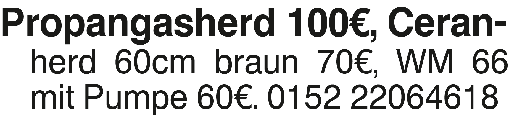 Propangasherd 100 EUR, Ce Propangasherd 100 EUR, Ceran- herd 60cm braun 70 EUR, WM 66 mit Pumpe 60 EUR. 0152 22064618