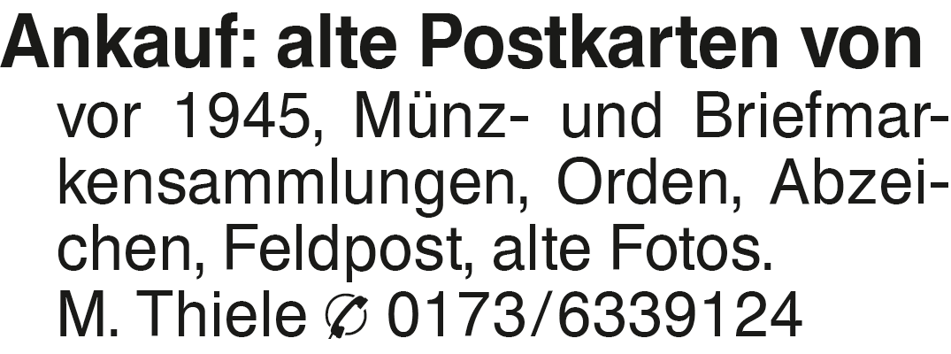Ankauf von Postkarten, Mü Ankauf: alte Postkarten von vor 1945, Münz- und Briefmarkensammlungen, Orden, Abzeichen, Feldpost, alte Fotos. M. Thiele 0173/6339124Das könnte Sie auch interessieren