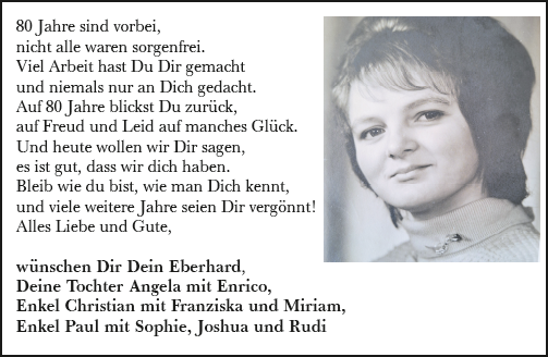80 Jahre sind vorbei, nic 80 Jahre sind vorbei, nicht alle waren sorgenfrei. Viel Arbeit hast Du Dir gemacht und niemals nur an Dich gedacht. Auf 80 Jahre blickst Du zurück, auf Freud und Leid auf manches Glück. Und heute wollen wir Dir sagen, es ist gut, dass wir dich haben. Bleib wie du bist, wie man Dich kennt, und viele weitere Jahre seien Dir vergönnt! Alles Liebe und Gute, wünschen Dir Dein Eberhard, Deine Tochter Angela mit Enrico, Enkel Christian mit Franziska und Miriam, Enkel Paul mit Sophie, Joshua und RudiKontakt