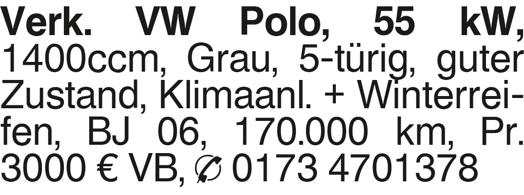 Verk. VW Polo, 55 kW, 140 Verk. VW Polo, 55 kW, 1400ccm, Grau, 5-türig, guter Zustand, Klimaanl. + Winterreifen, BJ 06, 170.000 km, Pr. 3000 EUR VB, 0173 4701378Das könnte Sie auch interessieren