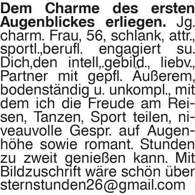 Dem Charme des ersten Aug Dem Charme des ersten Augenblickes erliegen. Jg. charm. Frau, 56, schlank, attr., sportl.,berufl. engagiert su. Dich,den intell,.gebild., liebv., Partner mit gepfl. Äußerem, bodenständig u. unkompl., mit dem ich die Freude am Reisen, Tanzen, Sport teilen, niveauvolle Gespr. auf Augenhöhe sowie romant. Stunden zu zweit genießen kann. Mit Bildzuschrift wäre schön über sternstunden26@gmail.comDas könnte Sie auch interessieren