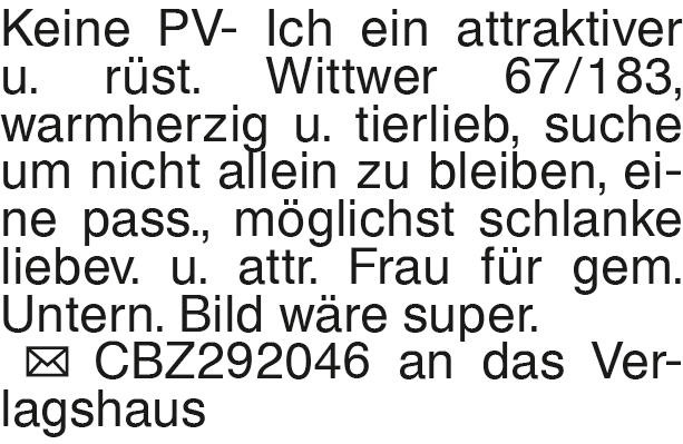 Keine PV- Ich ein attrakt Keine PV- Ich ein attraktiver u. rüst. Wittwer 67/183, warmherzig u. tierlieb suche um nicht allein zu bleiben eine pass., möglichst schlanke liebev. u. attr. Frau für gem. Untern. Bild wäre super.Das könnte Sie auch interessieren
