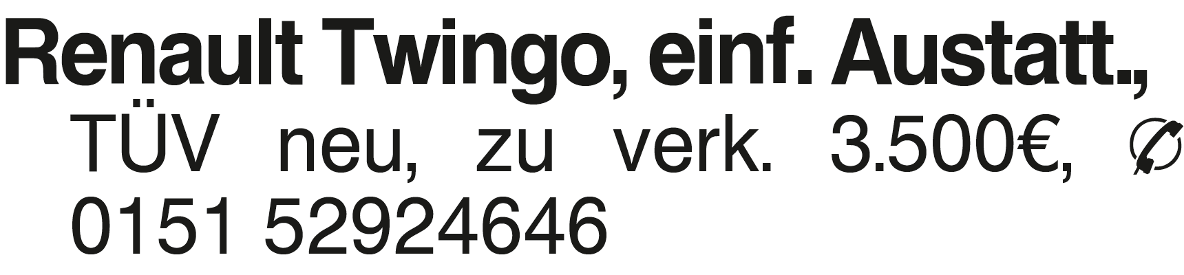 Renault Twingo, einf. Austat Renault Twingo, einf. Austatt., TÜV neu, zu verk. 3.500 EUR, 0151 52924646Das könnte Sie auch interessieren
