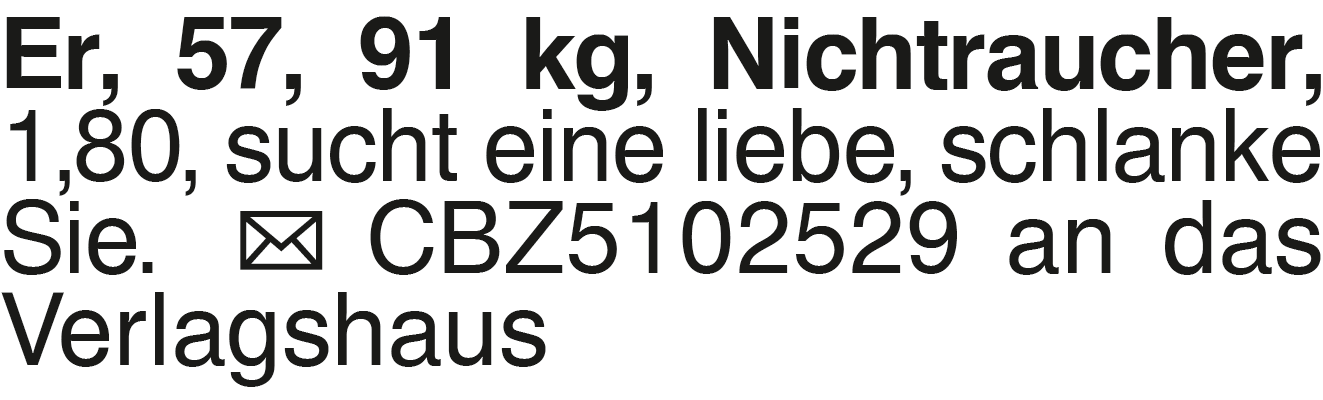 Er, 57, 91 kg, Nichtrauch Er, 57, 91 kg, Nichtraucher, 1,80, sucht eine liebe, schlanke Sie. CBZ5102529 an das VerlagshausDas könnte Sie auch interessieren