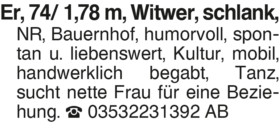 Er, 74/ 1,78 m, Witwer, s Er, 74/ 1,78 m, Witwer, schlank, NR, Bauernhof, humorvoll, spontan u. liebenswert, Kultur, mobil, handwerklich begabt, Tanz, sucht nette Frau für eine Beziehung. 03532231392 ABDas könnte Sie auch interessieren