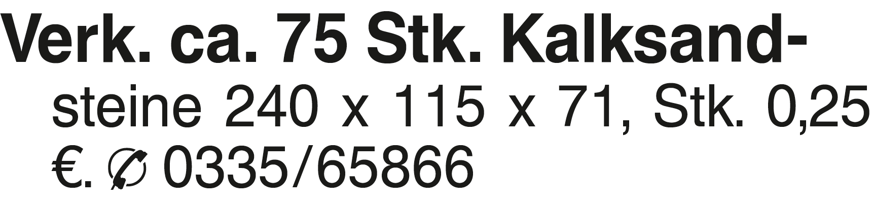 Verk. ca. 75 Stk. Kalksan Verk. ca. 75 Stk. Kalksand- steine 240 x 115 x 71, Stk. 0,25 EUR. 0335/65866Das könnte Sie auch interessieren