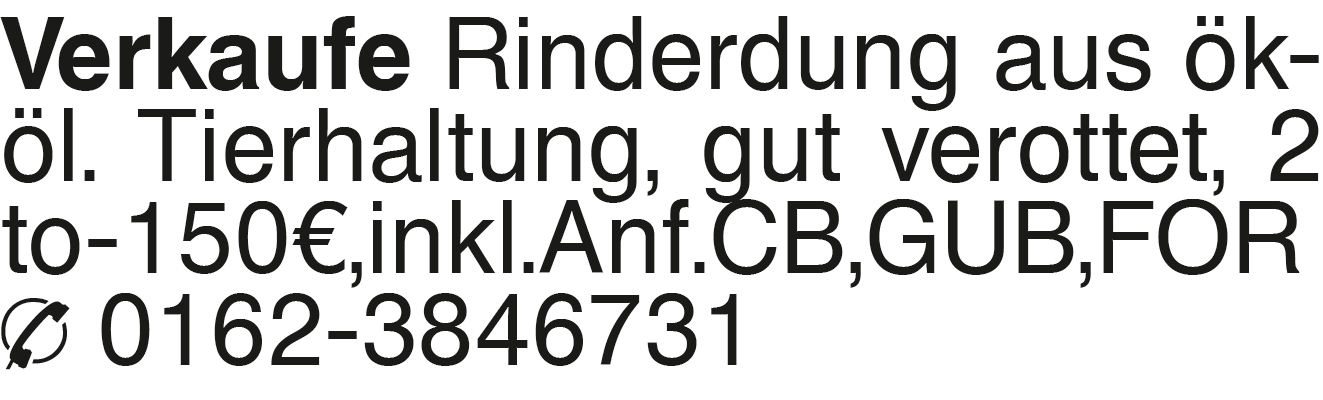 Verkaufe Rinderdung aus ö Rinderdung aus ököl. Tierhaltung, gut verottet, 2 to - 150 EUR inkl. Anf. CB,GUB,FOR Tel. 0162-3846731Das könnte Sie auch interessieren