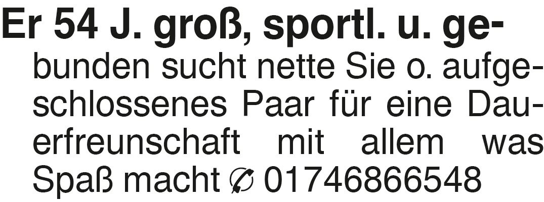Er 54 J. groß, sportl. u. Er 54 J. groß, sportl. u. ge- bunden sucht nette Sie o. aufgeschlossenes Paar für eine Dauerfreunschaft mit allem was Spaß macht 01746866548Das könnte Sie auch interessieren