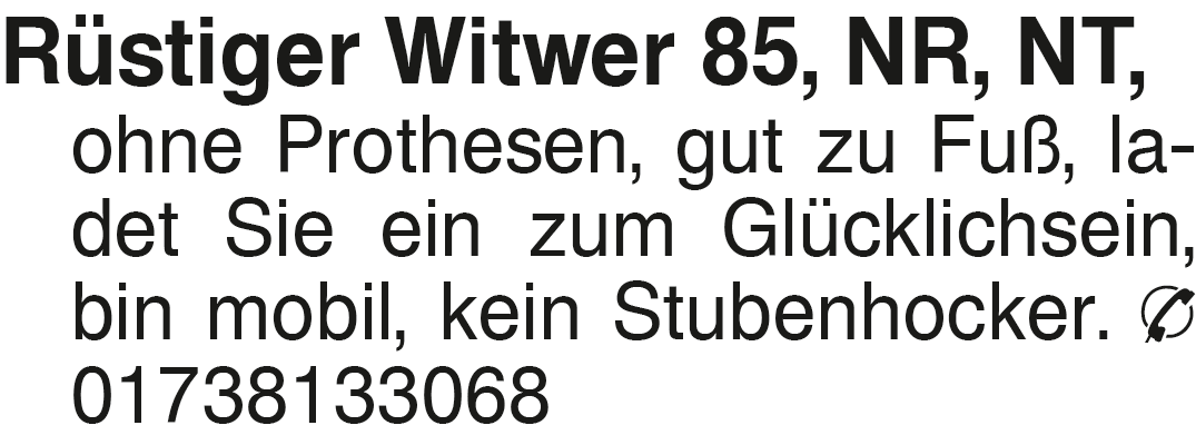 Rüstiger Witwer 85, NR, N Rüstiger Witwer 85, NR, NT, ohne Prothesen, gut zu Fuß, ladet Sie ein zum Glücklichsein, bin mobil, kein Stubenhocker. 01738133068Das könnte Sie auch interessieren
