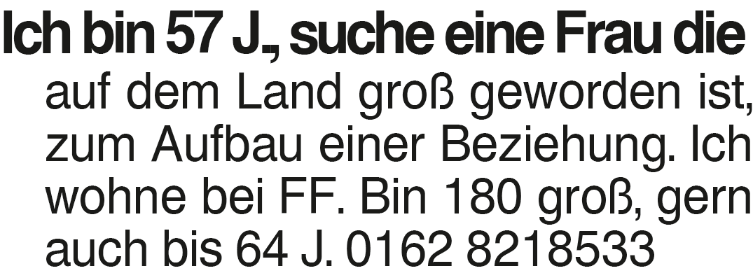 Ich bin 57 J., suche eine Ich bin 57 J., suche eine Frau die auf dem Land groß geworden ist, zum Aufbau einer Beziehung. Ich wohne bei FF. Bin 180 groß, gern auch bis 64 J. 0162 8218533