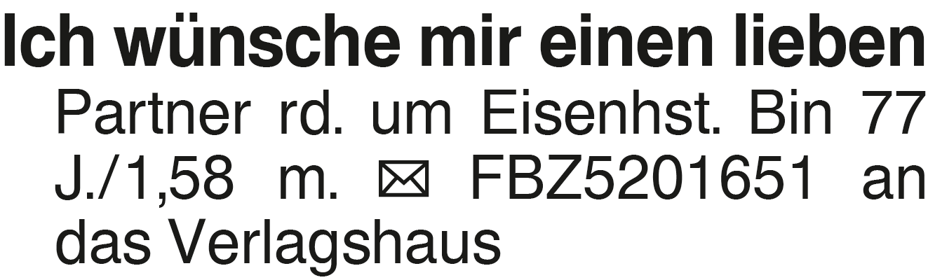 Ich wünsche mir einen lie Ich wünsche mir einen lieben Partner rd. um Eisenhst. Bin 77 J./1,58 m. FBZ5201651 an das VerlagshausDas könnte Sie auch interessieren