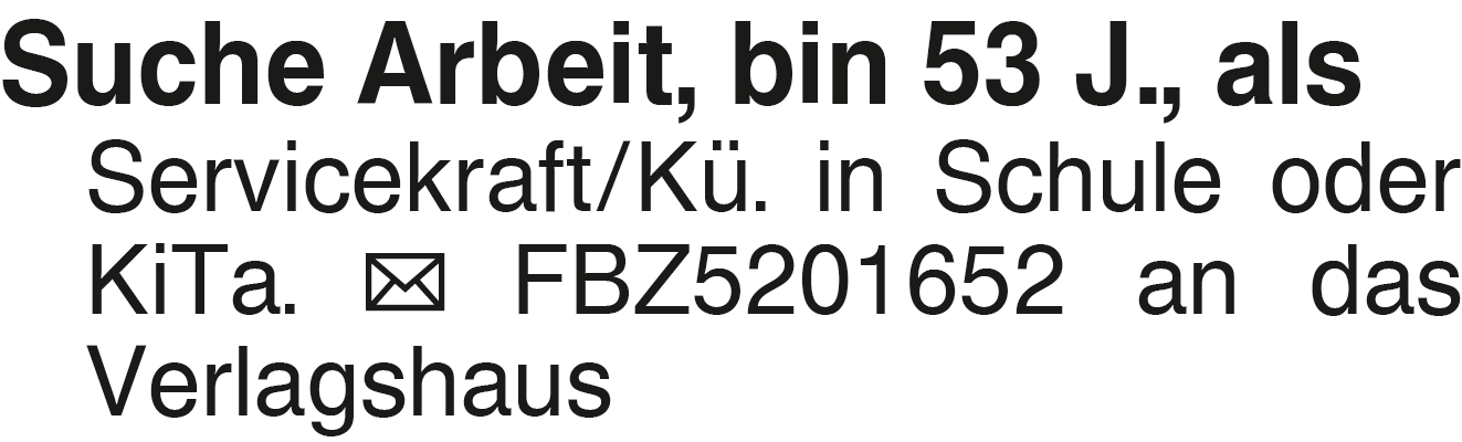 Suche Arbeit, bin 53 J., Suche Arbeit, bin 53 J., als Servicekraft/Kü. in Schule oder KiTa. FBZ5201652 an das Verlagshaus