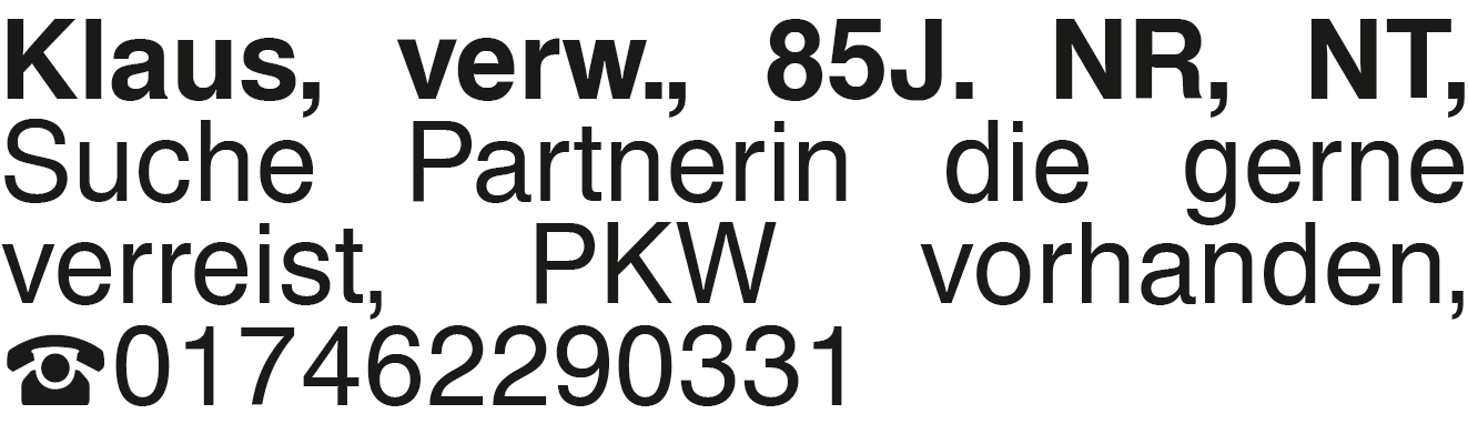 Klaus, verw., 85J. NR, NT Klaus, verw., 85J. NR, NT, Suche Partnerin die gerne verreist, PKW vorhanden, 017462290331Das könnte Sie auch interessieren