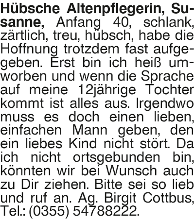 Susanne Hübsche Altenpflegerin, Susanne, Anfang 40, schlank, zärtlich, treu, hübsch, habe die Hoffnung trotzdem fast aufgegeben. Erst bin ich heiß umworben und wenn die Sprache auf meine 12jährige Tochter kommt ist alles aus. Irgendwo muss es doch einen lieben, einfachen Mann geben, den ein liebes Kind nicht stört. Da ich nicht ortsgebunden bin, könnten wir bei Wunsch auch zu Dir ziehen. Bitte sei so lieb und ruf an. Ag. Birgit Cottbus, Tel.: (0355) 54788222.Das könnte Sie auch interessieren
