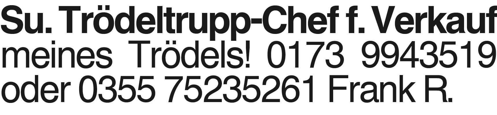 Su. Trödeltrupp-Chef für Verkauf Su. Trödeltrupp-Chef f. Verkauf meines Trödels! 0173 9943519 oder 0355 75235261 Frank R.Das könnte Sie auch interessieren