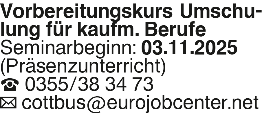 Vorbereitungskurs Umschulung Vorbereitungskurs Umschu-lung für kaufm. Berufe Seminarbeginn: 03.11.2025 (Präsenzunterricht) 0355/38 34 73 cottbus@eurojobcenter.netKontakt