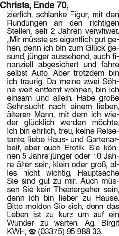 Erscheinungsdatum: Anzeige vom 11.10.2025 in der Rubrik "Ehe-/ Partnervermittlungen"