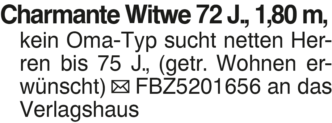 Charmante Witwe 75 J., 1, Charmante Witwe 72 J., 1,80 m, kein Oma-Typ sucht netten Herren bis 75 J., (getr. Wohnen erwünscht) FBZ5201656 an das Verlagshaus