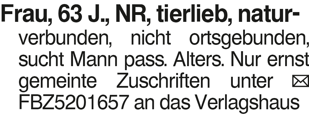 Frau, 63 J., NR, tierlieb Frau, 63 J., NR, tierlieb, natur- verbunden, nicht ortsgebunden, sucht Mann pass. Alters. Nur ernst gemeinte Zuschriften unter FBZ5201657 an das VerlagshausDas könnte Sie auch interessieren