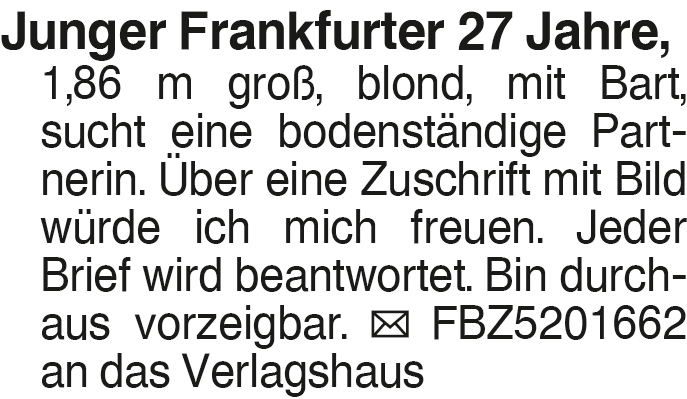 Junger Frankfurter 27 Jah Junger Frankfurter 27 Jahre, 1,86 m groß, blond, mit Bart, sucht eine bodenständige Partnerin. Über eine Zuschrift mit Bild würde ich mich freuen. Jeder Brief wird beantwortet. Bin durchaus vorzeigbar. FBZ5201662 an das Verlagshaus