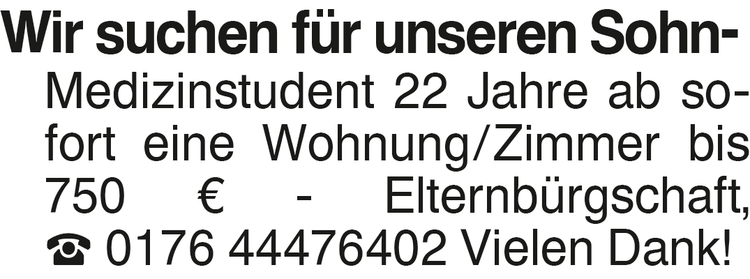Wir suchen für unseren So Wir suchen für unseren Sohn- Medizinstudent 22 Jahre ab sofort eine Wohnung/Zimmer bis 750 EUR - Elternbürgschaft, 0176 44476402 Vielen Dank!