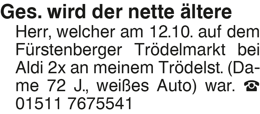 Ges. wird der nette älter Ges. wird der nette ältere Herr, welcher am 12.10. auf dem Fürstenberger Trödelmarkt bei Aldi 2x an meinem Trödelst. (Dame 72 J., weißes Auto) war. 01511 7675541Das könnte Sie auch interessieren
