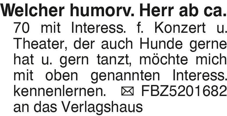 Welcher humorv. Herr ab c Welcher humorv. Herr ab ca. 70 mit Interess. f. Konzert u. Theater, der auch Hunde gerne hat u. gern tanzt, möchte mich mit oben genannten Interess. kennenlernen. FBZ5201682 an das VerlagshausDas könnte Sie auch interessieren