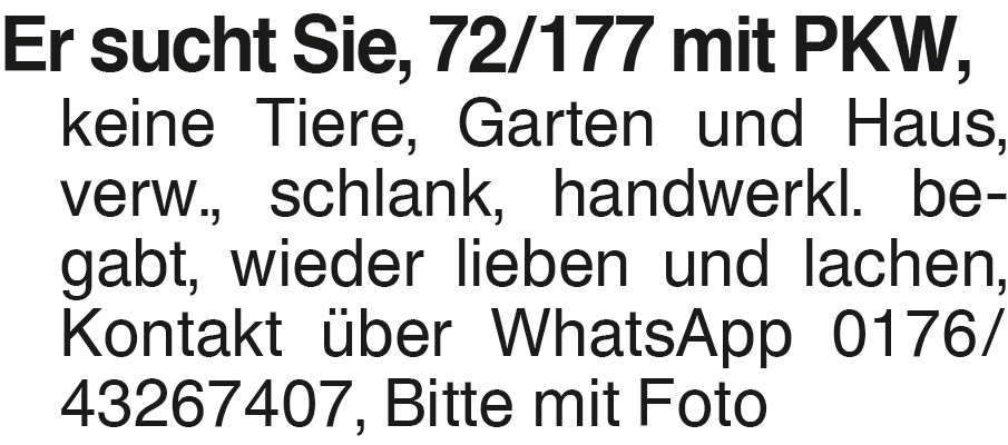Er sucht Sie, 72/177 mit Er sucht Sie, 72/177 mit PKW, keine Tiere, Garten und Haus, verw., schlank, handwerkl. begabt, wieder lieben und lachen, Kontakt über WhatsApp 0176/43267407, Bitte mit Foto