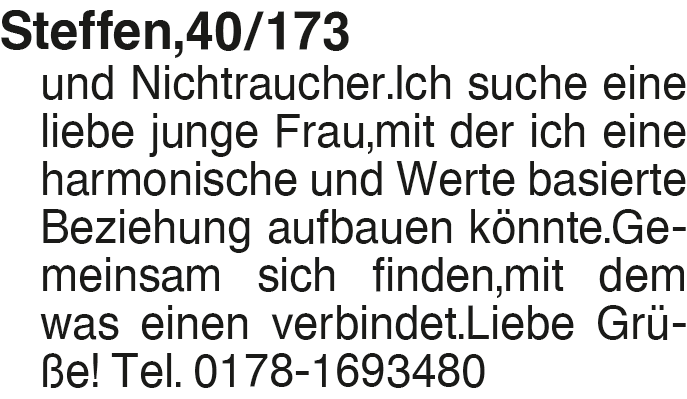 Steffen,40/173 und Nichtr und Nichtraucher.Ich suche eine liebe junge Frau,mit der ich eine harmonische und Werte basierte Beziehung aufbauen könnte.Gemeinsam sich finden,mit dem was einen verbindet.Liebe Grüße! Tel. 0178-1693480Das könnte Sie auch interessieren
