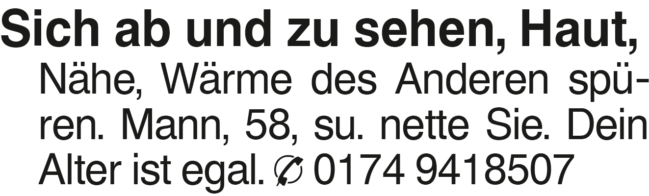 Sich ab und zu sehen, Hau Sich ab und zu sehen, Haut, Nähe, Wärme des Anderen spüren. Mann, 58, su. nette Sie. Dein Alter ist egal. 0174 9418507Das könnte Sie auch interessieren
