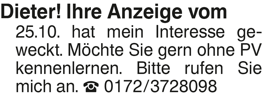 Dieter! Ihre Anzeige vom Dieter! Ihre Anzeige vom 25.10. hat mein Interesse geweckt. Möchte Sie gern ohne PV kennenlernen. Bitte rufen Sie mich an. 0172/3728098Das könnte Sie auch interessieren