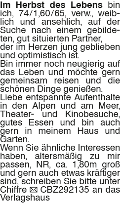 Im Herbst des Lebens bin bin ich, 74/1,60/65, verw., weiblich und ansehlich, auf der Suche nach einem gebildeten, gut situierten Partner, der im Herzen jung geblieben und optimistisch ist. Bin immer noch neugierig auf das Leben und möchte gern gemeinsam reisen und die schönen Dinge genießen. Liebe entspannte Aufenthalte in den Alpen und am Meer, Theater- und Kinobesuche, gutes Essen und bin auch gern in meinem Haus und Garten. Wenn Sie ähnliche Interessen haben, altersmäßig zu mir passen, NR, ca. 1,80m groß und gern auch etwas kräftiger sind, schreiben Sie bitte unter ChiffreDas könnte Sie auch interessieren