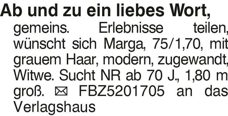 Ab und zu ein liebes Wort Ab und zu ein liebes Wort, gemeins. Erlebnisse teilen, wünscht sich Marga, 75/1,70, mit grauem Haar, modern, zugewandt, Witwe. Sucht NR ab 70 J., 1,80 m groß. FBZ5201705 an das Verlagshaus