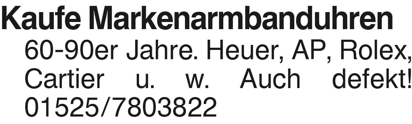 Kaufe Markenarmbanduhren Kaufe Markenarmbanduhren 60-90er Jahre. Heuer, AP, Rolex, Cartier u. w. Auch defekt! 01525/7803822Das könnte Sie auch interessieren
