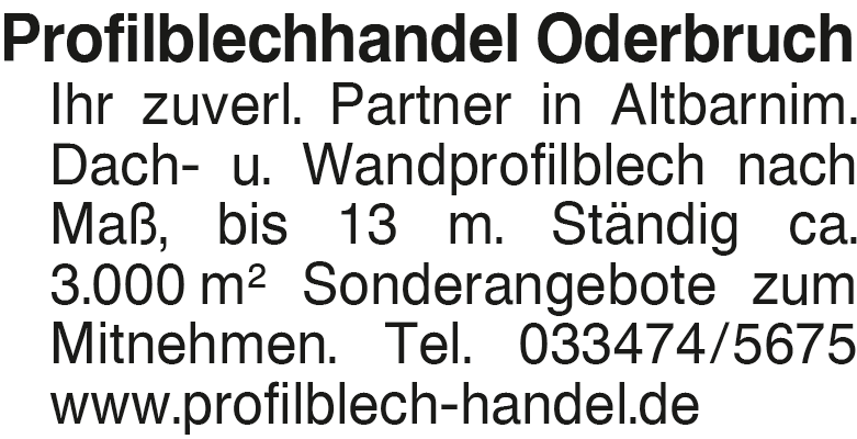 Profilblechhandel Oderbru Profilblechhandel Oderbruch Ihr zuverl. Partner in Altbarnim. Dach- u. Wandprofilblech nach Maß, bis 13 m. Ständig ca. 3.000 m2 Sonderangebote zum Mitnehmen. Tel. 033474/5675 www.profilblech-handel.deDas könnte Sie auch interessieren