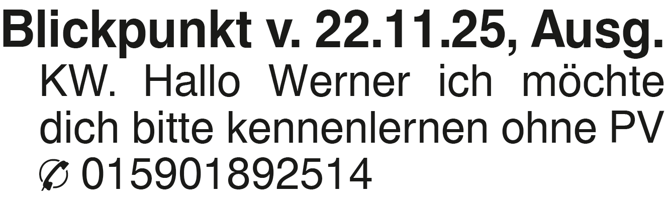 Blickpunkt v. 22.11.25, A Blickpunkt v. 22.11.25, Ausg. KW. Hallo Werner ich möchte dich bitte kennenlernen ohne PV 015901892514Das könnte Sie auch interessieren