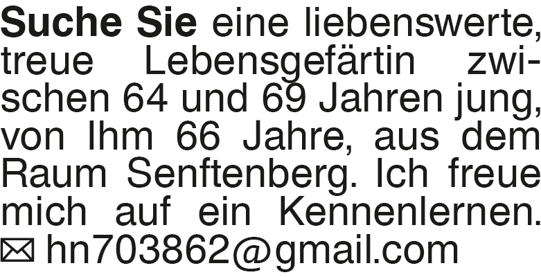 Suche Sie eine liebenswer eine liebenswerte, treue Lebensgefärtin zwischen 64 und 69 Jahren jung, von Ihm 66 Jahre, aus dem Raum Senftenberg. Ich freue mich auf ein Kennenlernen. hn703862@gmail.comDas könnte Sie auch interessieren