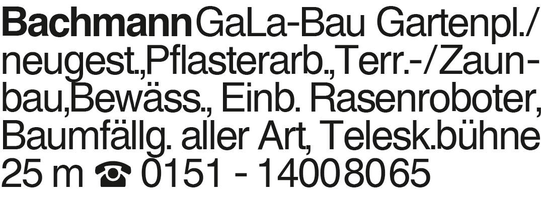 Bachmann GaLa-Bau Gartenpl. Bachmann GaLa-Bau Gartenpl./ neugest.,Pflasterarb.,Terr.-/Zaunbau,Bewäss., Einb. Rasenroboter, Baumfällg. aller Art, Telesk.bühne 25 m 0151 - 1400 80 65Das könnte Sie auch interessieren