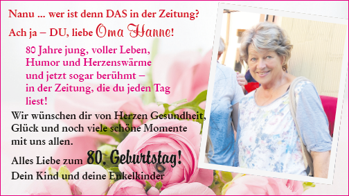 Nanu # wer ist denn DAS i Nanu # wer ist denn DAS in der Zeitung? Ach ja # DU, liebe Oma Hanne! 80 Jahre jung, voller Leben, Humor und Herzenswärme und jetzt sogar berühmt # in der Zeitung, die du jeden Tag liest! Wir wünschen dir von Herzen Gesundheit, Glück und noch viele schöne Momente mit uns allen. Alles Liebe zum 80. Geburtstag! Dein Kind und deine Enkelkinder