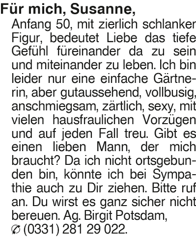 Erscheinungsdatum: Anzeige vom 17.1.2026 in der Rubrik "Ehe-/ Partnervermittlungen"
