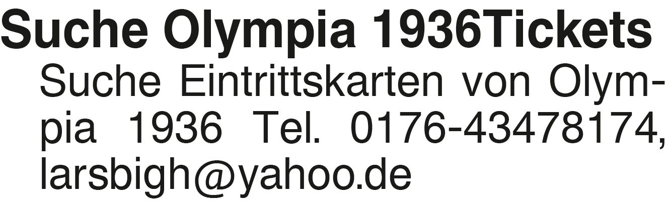Suche Olympia 1936Tickets Suche Eintrittskarten von Olympia 1936 Tel. 0176-43478174, larsbigh@yahoo.deDas könnte Sie auch interessieren