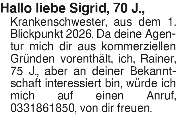 Hallo liebe Sigrid, 70 J. Hallo liebe Sigrid, 70 J., Krankenschwester, aus dem 1. Blickpunkt 2026. Da deine Agentur mich dir aus kommerziellen Gründen vorenthält, ich, Rainer, 75 J., aber an deiner Bekanntschaft interessiert bin, würde ich mich auf einen Anruf, 0331861850, von dir freuen.Das könnte Sie auch interessieren