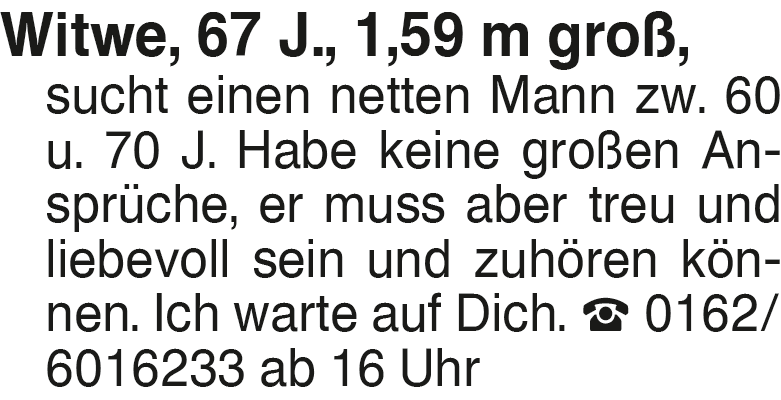 Witwe, 67 J., 1,59 m groß Witwe, 67 J., 1,59 m groß, sucht einen netten Mann zw. 60 u. 70 J. Habe keine großen Ansprüche, er muss aber treu und liebevoll sein und zuhören können. Ich warte auf Dich. 0162/6016233 ab 16 UhrDas könnte Sie auch interessieren