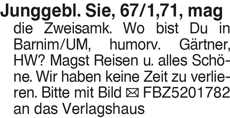 Junggebl. Sie, 67/1,71, m Junggebl. Sie, 67/1,71, mag die Zweisamk. Wo bist Du in Barnim/UM, humorv. Gärtner, HW? Magst Reisen u. alles Schöne. Wir haben keine Zeit zu verlieren. Bitte mit Bild FBZ5201782 an das VerlagshausDas könnte Sie auch interessieren