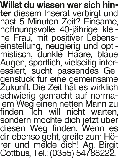 40-jährige kleine Frau Willst du wissen wer sich hinter diesem Inserat verbirgt und hast 5 Minuten Zeit? Einsame, hoffnungsvolle 40-jährige kleine Frau, mit positiver Lebenseinstellung, neugierig und optimistisch, dunkle Haare, blaue Augen, sportlich, vielseitig interessiert, sucht passendes Gegenstück für eine gemeinsame Zukunft. Die Zeit hat es wirklich schwierig gemacht auf normalem Weg einen netten Mann zu finden. Ich will nicht warten, sondern möchte dich jetzt über diesen Weg finden. Wenn es dir ebenso geht, greife zum Hörer und melde dich! Ag. Birgit Cottbus, Tel.: (0355) 54788222.Das könnte Sie auch interessieren