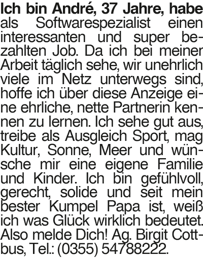 André Ich bin André, 37 Jahre, habe als Softwarespezialist einen interessanten und super bezahlten Job. Da ich bei meiner Arbeit täglich sehe, wir unehrlich viele im Netz unterwegs sind, hoffe ich über diese Anzeige eine ehrliche, nette Partnerin kennen zu lernen. Ich sehe gut aus, treibe als Ausgleich Sport, mag Kultur, Sonne, Meer und wünsche mir eine eigene Familie und Kinder. Ich bin gefühlvoll, gerecht, solide und seit mein bester Kumpel Papa ist, weiß ich was Glück wirklich bedeutet. Also melde Dich! Ag. Birgit Cottbus, Tel.: (0355) 54788222.Das könnte Sie auch interessieren