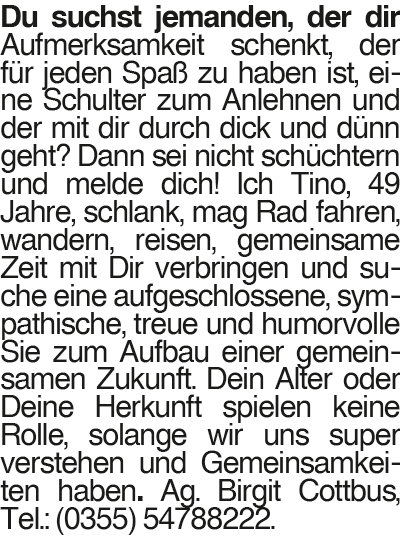 Tino Du suchst jemanden, der dir Aufmerksamkeit schenkt, der für jeden Spaß zu haben ist, eine Schulter zum Anlehnen und der mit dir durch dick und dünn geht? Dann sei nicht schüchtern und melde dich! Ich Tino, 49 Jahre, schlank, mag Rad fahren, wandern, reisen, gemeinsame Zeit mit Dir verbringen und suche eine aufgeschlossene, sympathische, treue und humorvolle Sie zum Aufbau einer gemeinsamen Zukunft. Dein Alter oder Deine Herkunft spielen keine Rolle, solange wir uns super verstehen und Gemeinsamkeiten haben. Ag. Birgit Cottbus, Tel.: (0355) 54788222.Das könnte Sie auch interessieren