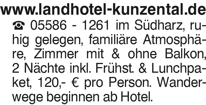 www.landhotel-kunzental.d www.landhotel-kunzental.de 05586 - 1261 im Südharz, ruhig gelegen, familiäre Atmosphäre, Zimmer mit & ohne Balkon, 2 Nächte inkl. Frühst. & Lunchpaket, 120,- EUR pro Person. Wanderwege beginnen ab Hotel.Kontakt