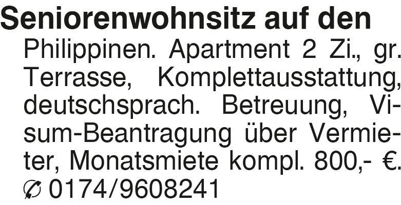 Seniorenwohnsitz auf den Seniorenwohnsitz auf den Philippinen. Apartment 2 Zi., gr. Terrasse, Komplettausstattung, deutschsprach. Betreuung, Visum-Beantragung über Vermieter, Monatsmiete kompl. 800,- EUR. 0174/9608241Kontakt